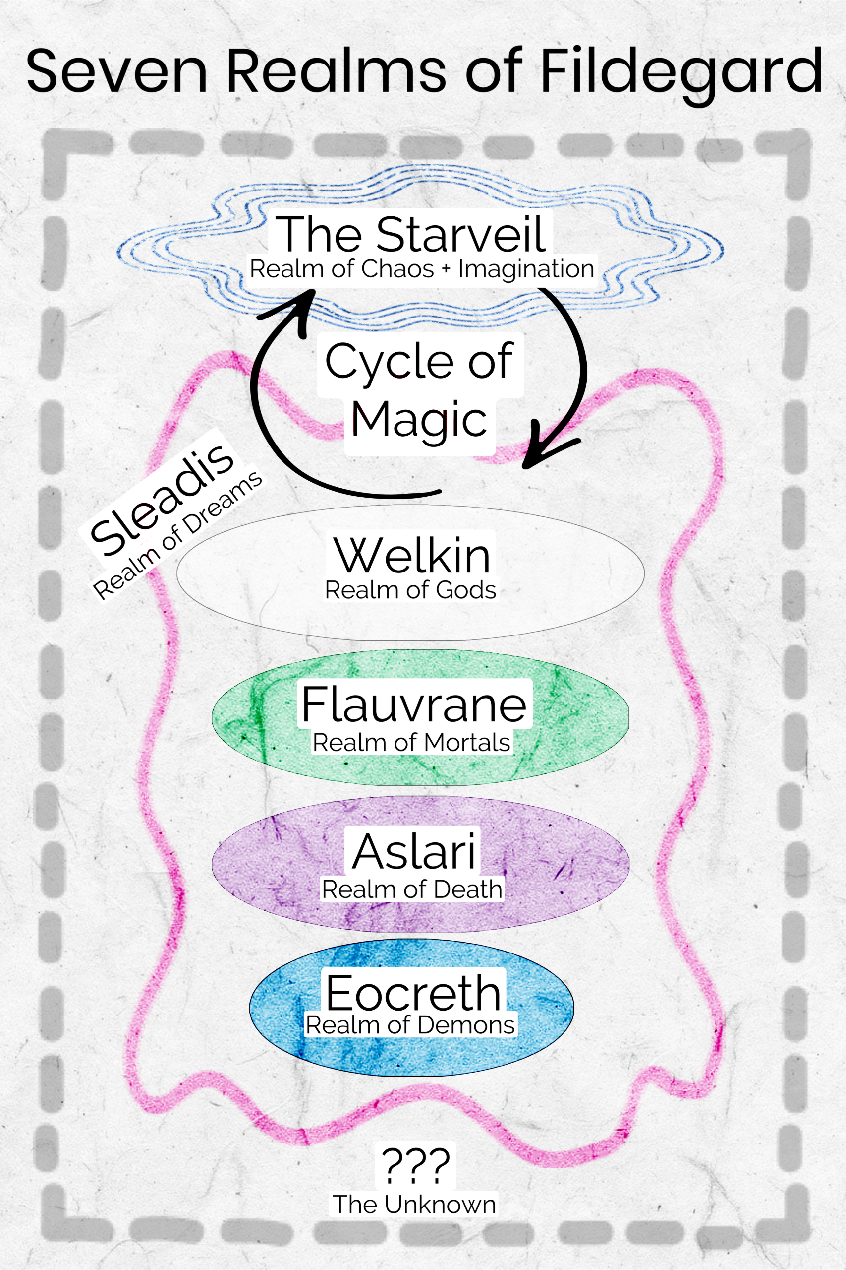 (Fĭl-dē-gärd)A universe of seven realms, all joined by the flow of the Cycle of Magic. Several thousand years ago, the mortal realm, Flauvrane, faced a cataclysmic event referred to as the Unearthing. This event significantly hampered the growth of humans of this universe, resulting in them evolving differently based on their area of origin. The following period, referred to the Age of Restoration, began as the remnant of the previous god was slain and a new Parent God took the helm (Do not cross her at any cost, she is not to be trifled with.) But the insidious Core of Magic still exists and we are certain the locals will have to confront their reality soon.